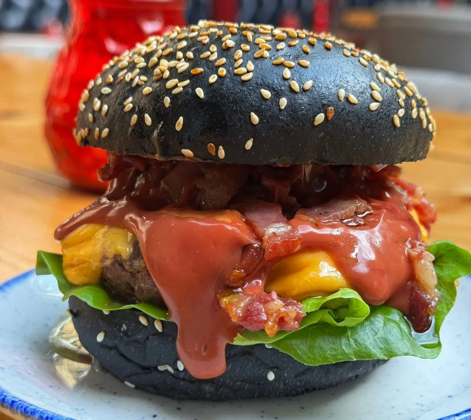 Beef patty, black pudding, red cheese sauce, pancetta lardon, American cheese, baby gem lettuce + reaper mayo in a charcoal bun.