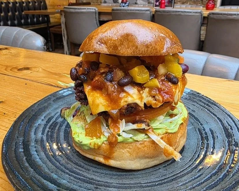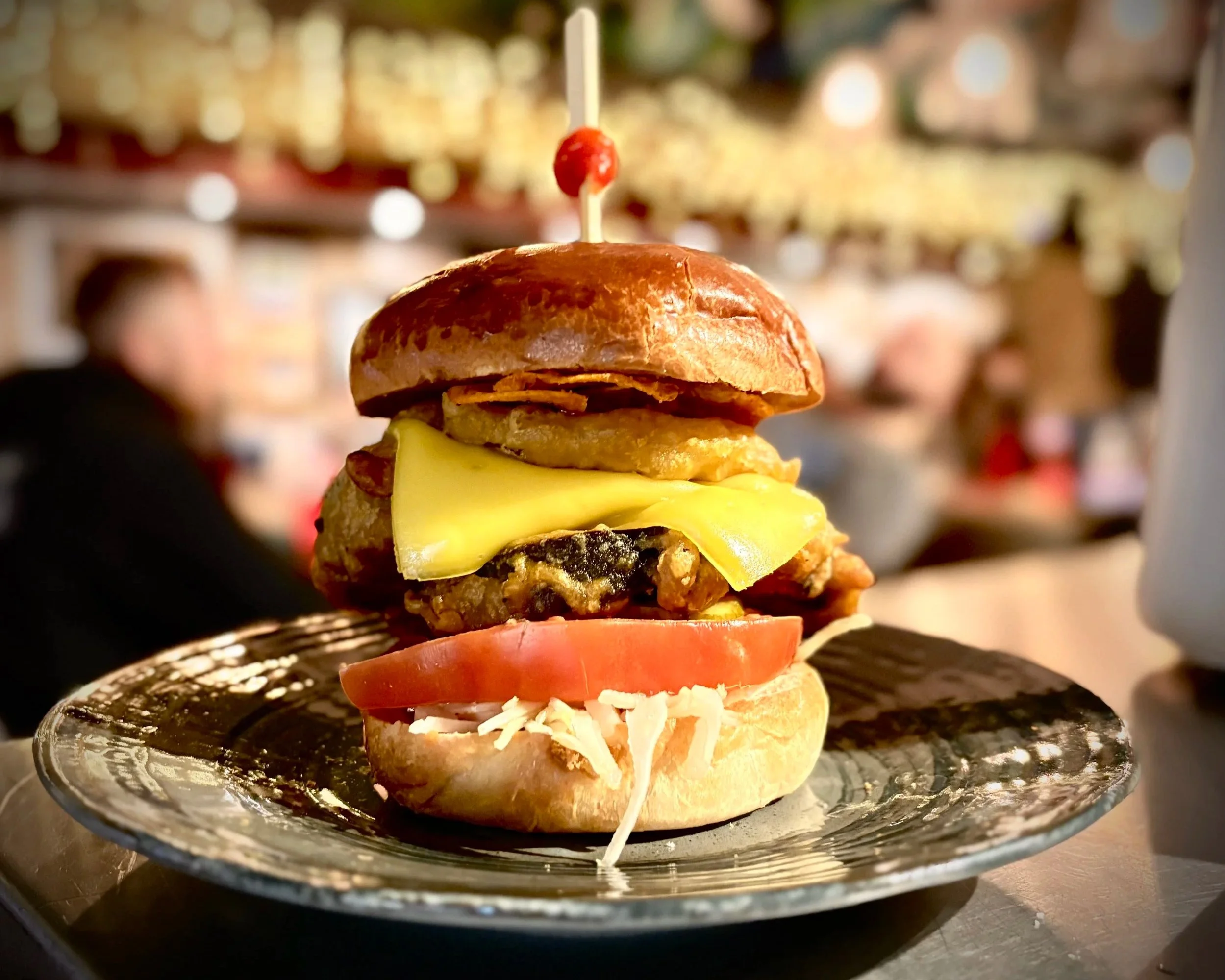Smok’d deep fried aubergine, charred hispi cabbage, vegan cheese, an onion ring, tomato, pickles, mango chutney, paprika crisps, garlic aioli + a sweet red pepper drop.