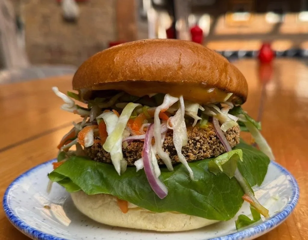 Pumpkin Patty, Katsu sauce, baby gem lettuce, lime slaw and sambal mayo on a plant based brioche bun.